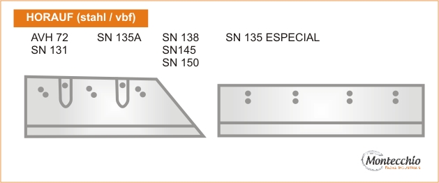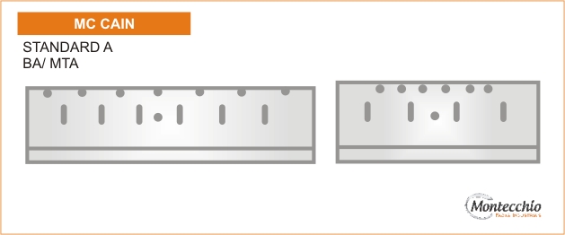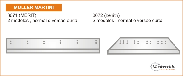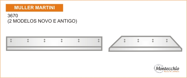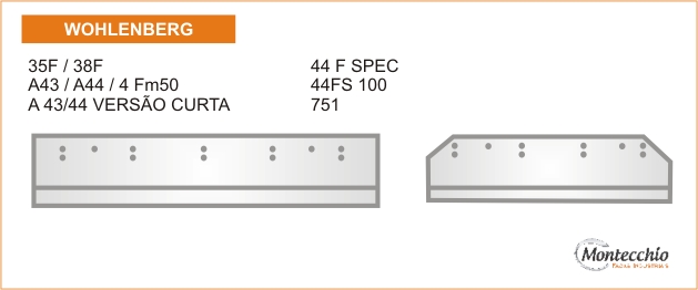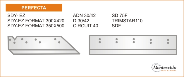 Desenvolvidas através dos padrões originais das máquinas, com tratamento térmico específico, para maior resistência em cortes de alta velocidade, as quais são exigidas em máquinas trilaterais lombada quadrada que assegura a dureza e maior resistência em cortes de papel. As Facas Trilaterais Montecchio são importadas em aço calçado CrWmn / HSS ou Widia.
